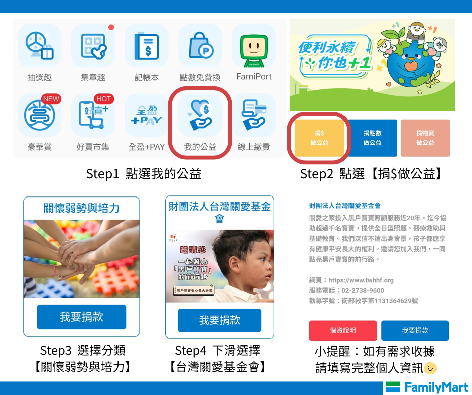 至附近全家便利商店⮕點選「公益」⮕「愛心捐款」⮕「關懷弱勢與培力」⮕「關愛基金會」 - 方法二:全家APP: