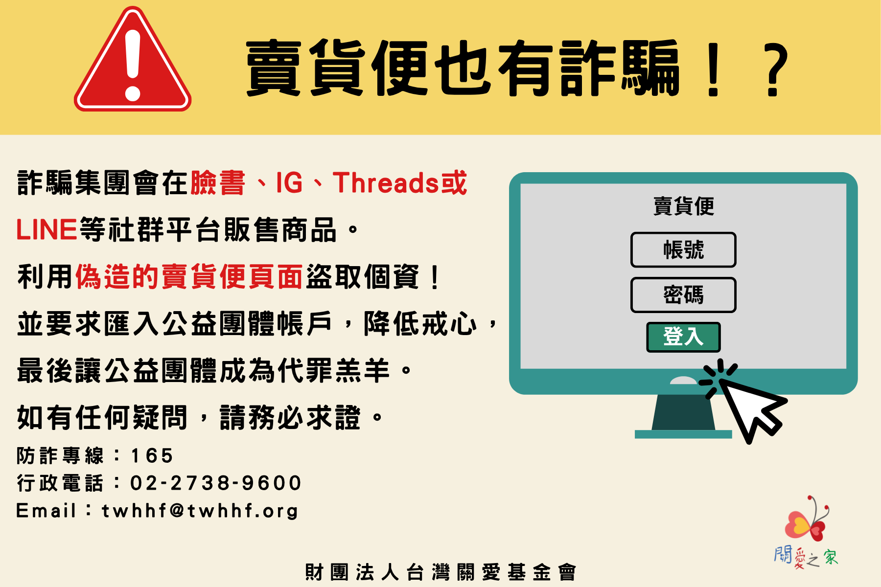 📌關愛基金會絕不會參與或代收任何個人買賣金流,也不會透過社群販售商品,更不會要求你私下匯款購物!